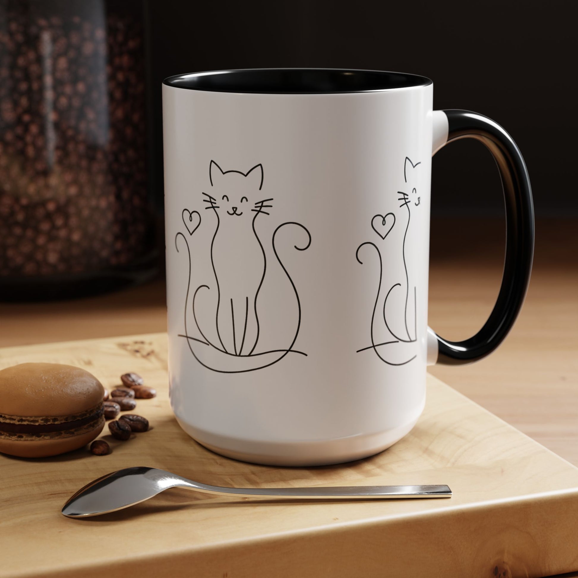 Cute Line Art Cat Coffee Mug — Minimalist Cat Paw Heart Accent Mug (11/15oz)